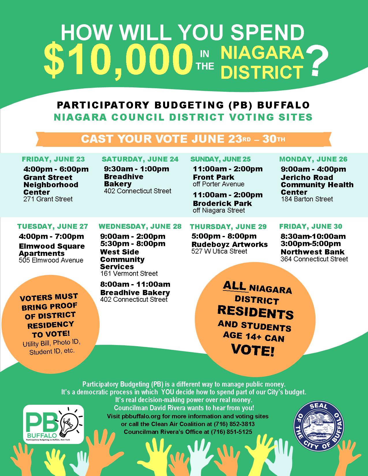 This year, Common Councilman David Rivera’s office is running a pilot PB Project in the Niagara District. From January to June, nearly a dozen community projects were generated by residents in the district at community meetings. Volunteer Budget Delegates worked to develop these ideas into projects. These projects will go up for a community wide vote the week of June 23rd through July 1st. All Niagara District residents and Students age 14+ can Vote! Voters must bring proof of district residency (a utility bill, photo id, student id etc) to vote.