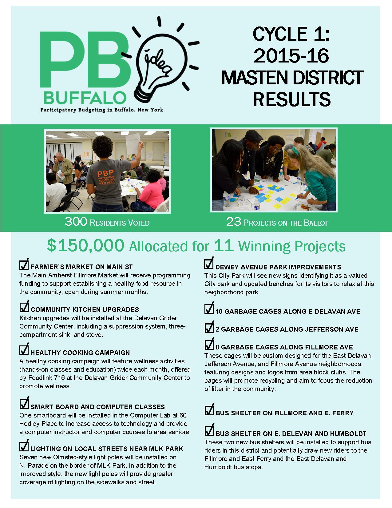 Winning projects for the First Cycle of Participatory Budgeting (PB) in Buffalo have been tallied and announced! Over 300 residents came out to 8 different voting locations over the span of 6 days in various locations throughout the Masten District to decide on how to spend $150,000. The winning projects, in order, are:
